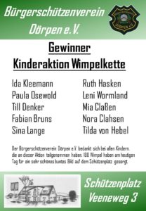 Der Bürgerschützenverein Dörpen e.V. bedankt sich bei allen Kindern, die an dieser Aktion teilgenommen haben. 100 Wimpel haben am heutigen Tag für ein sehr schönes buntes Bild auf dem Schützenplatz gesorgt.